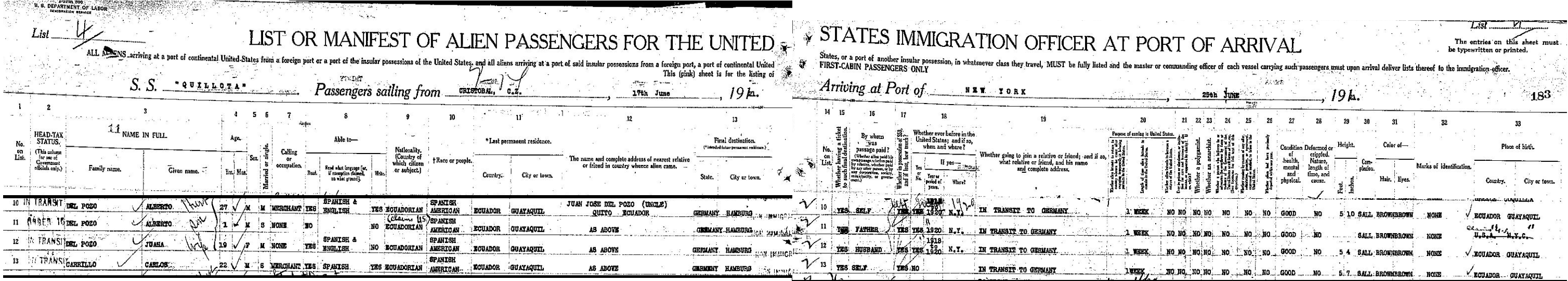A ship’s manifest shows that in June of 1921 Alberto and Juana passed through the port of New York “In transit to Germany” (Hamburg). Their one-year-old baby Alberto was with them and a 22-year-old “Carlos Carillo” was also with them. We don’t know who Carlos was but it seems likely that he was the older brother of Juana. The ship’s origin is listed as Cristobal (Panama canal) so they were probably coming from Guayaquil. They were to remain in New York for a week before departing for Germany and the occupation of both Carlos and Alberto is listed as “Merchant”. Perhaps this trip to Germany was related to their job; currently we don’t know. But we do know that their second son “Nicholas” would be born in 1922 (9/12/22). A present-day descendant of Nicholas, Natalia Del Pozo, lists her ancestor Nicholas’ place of birth as Hamburg Germany (on Ancestry.com). This would suggest either that they stayed in Germany for more than a year or that they made more than one trip to Germany.