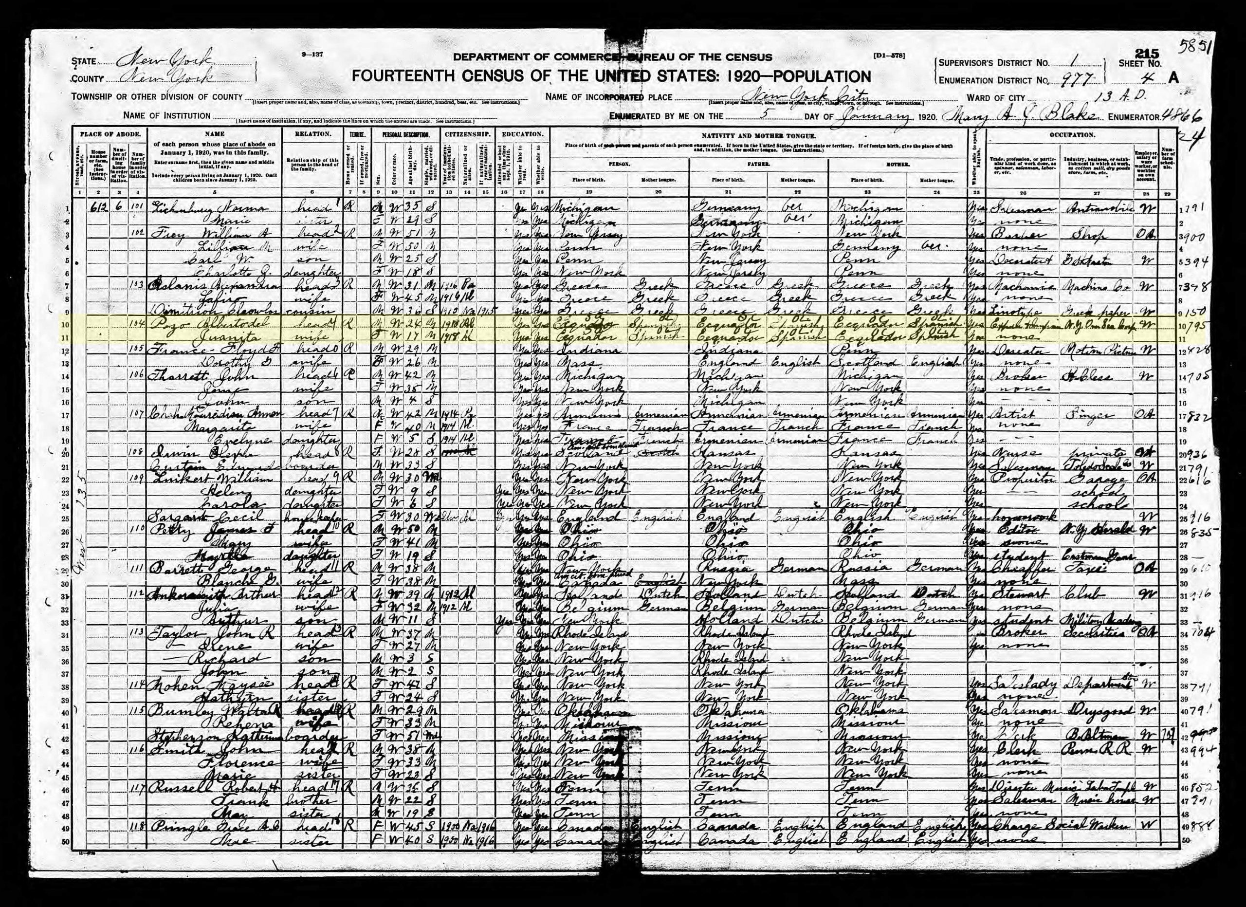 | US Gov’t | 1920 Census document showing Alberto and Juanita in New York |
