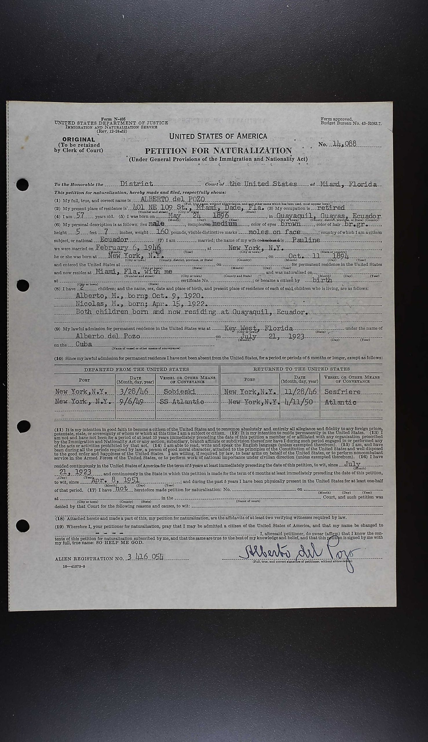 | US Gov’t | 1953 Alberto’s petition for naturalization (Citizenship); aged 57yrs and “Retired”. Still married to Pauline and residing in Miami. |