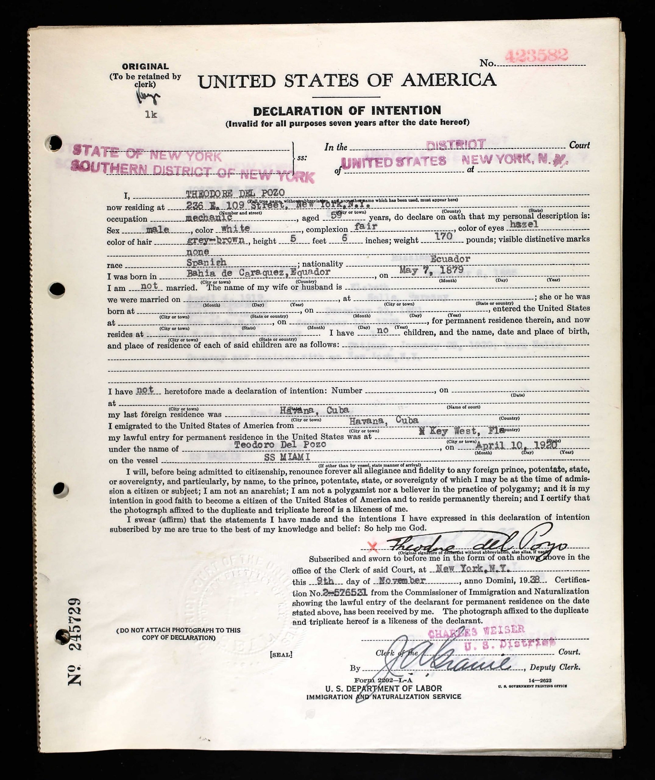 Teodoro seems to have first arrived in the U.S. in April of 1920, ten months after the arrival of his very ill older sister Maria Teresa and just a few months before her death. At Key West, his port of entry, he told the Immigration official that he was headed for a hotel in New York where he would join his brother Alberto Del Pozo, that it was his first time in the U.S., that his last permanent residence was Havana, Cuba, and that he had been born in Bahia Ecuador8 Later, in 1923, he shows up as having arrived at Ellis Island on a ship from Barcelona, the SS Montserrat. The record shows his full correct name Theodoro Del Pozo Santos with the same incorrect birth date that he had used in 1920 (1896). His use of the maternal last name “Santos” would indicate that he was saying that Ines Santos was his real mother. This is the only document where he gave that two-part last name. The document shows that he was detained for some reason by immigration officials but ultimately allowed to enter.