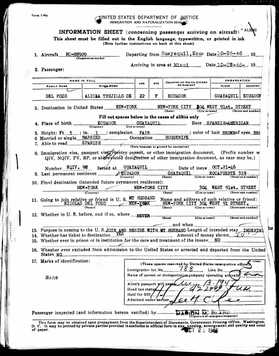 | US Gov’t | Alberto and Juana’s son Nicolas was married to Alicia Trujillo. She arrived on a flight from Guayaquil in 1946 and her Immigration Document is available. Their permanent residence shows up on that document as 304 W. 91st Street, NYC at that time. |