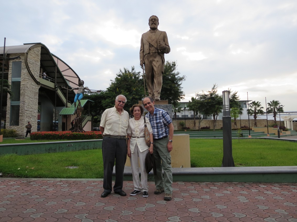 Three Grandchildren of Dr. Martinez in front of a statue of President Emilio Estrada. L to R: Miguel Martinez Davalos, Maria Elvira Martinez Davalos, Patrick Connolly Martinez